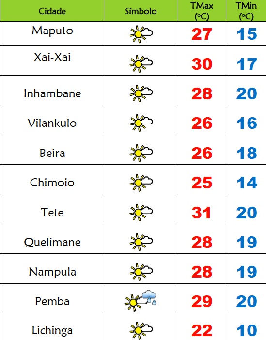Nas províncias de Inhambane, Gaza e Maputo o INAM prevê céu pouco nublado a limpo; Ocorrência de neblinas ou nevoeiros matinais, principalmente na província de Inhambane e sul de Maputo; Vento de leste a nordeste, temporariamente de noroeste fraco a moderado.