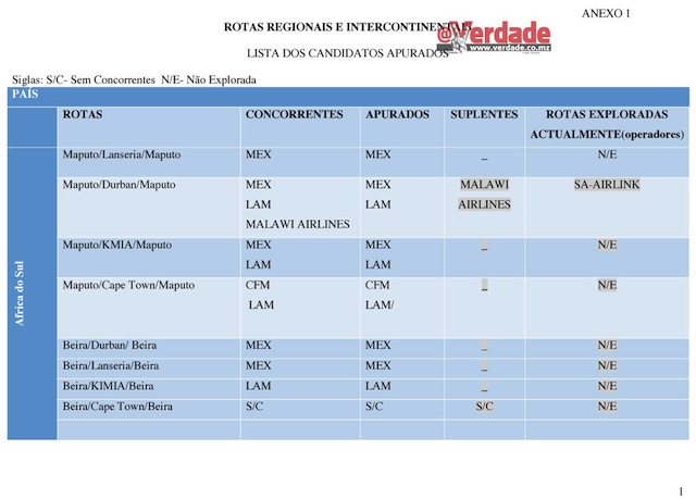 Estranhamente, entre as 28 rotas disponibilizadas para a vizinha África do Sul, não consta a rota Maputo – Johannesburgo – Maputo que é actualmente operada somente pelas Linhas Aéreas de Moçambique(LAM) e a South Africa Airways(SAA).