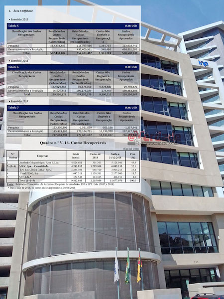 Além disso estas auditorias divulgadas na semana passada referem-se apenas aos exercícios 2015, 2016 e 2017, contudo o TA vem alertando, desde 2017, que não foram auditados nem certificados os custos dos investimentos que foram realizados pela Eni e Andardarko desde 2007. “Os custos de exploração (recuperáveis) da Anadarko e ENI fixavam-se, a 31/12/2014, em 3.942.434,5 mil USD e 2.435.747 mil USD, respectivamente”, apurou o @Verdade no Relatório do TA sobre a Conta Geral do Estado(CGE) de 2014.