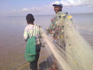 Outras, obrigadas pela vida, levavam os seus bebés às costas, arrastando com elas a rede por debaixo do frio, por vezes sob fustigação da chuva, mas todo esse sofrimento era compensado. No mesmo cesto (lisengwe, em bitonga), a par do camarão, eram apanhadas outras espécies, como makhulu, um tipo de peixe minúsculo, muito saboroso quando frito, e aconselhável para o mata-bicho. Vinha makhulu e lula e carangueijo e mais, para alimentar os bitongas, e por sua vez os vathswa e chopis, que vieram para aqui atraídos pelo mar e pela beleza dos barcos à vela.
