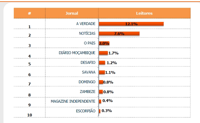Em segundo lugar na lista dos jornais diários e semanários de informação mais lidos em Moçambique surge o ‘Jornal Notícias’, com 7,6% de audiência seguido pelo “Jornal O País”, com 2% de audiência. O “Diário de Moçambique”, publicado na cidade da Beira, surge em quarto lugar, com uma audiência de 1,7%, seguido do semanário desportivo “Desafio” com 1,2% de audiência. O semanário independente “Savana” é o sexto jornal mais lido de Moçambique com 1,1%.