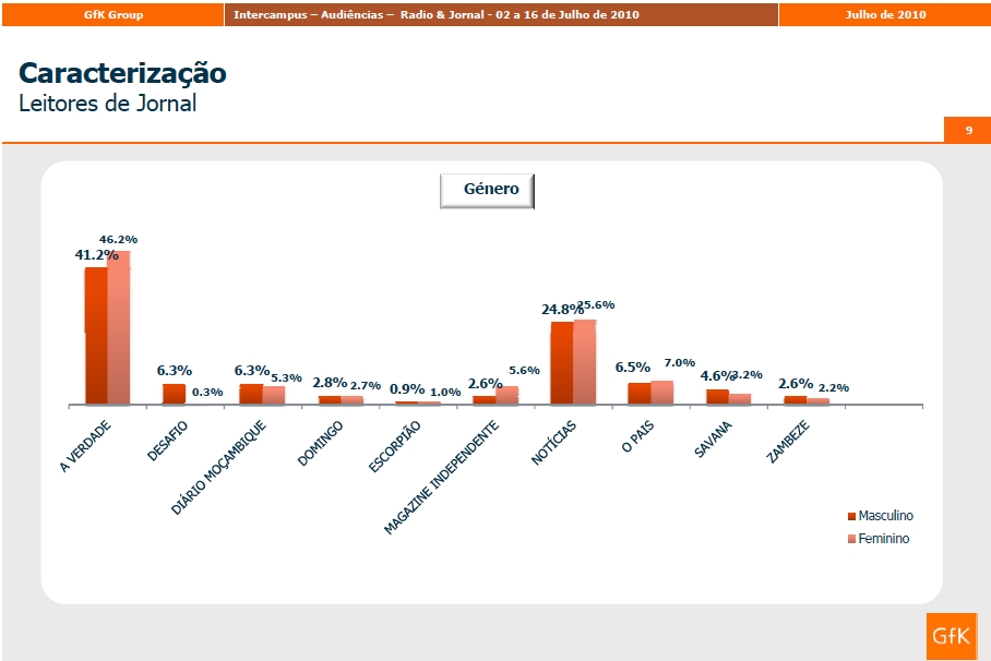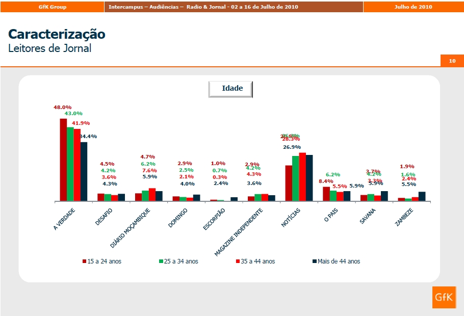 O Jornal @Verdade é o jornal preferido dos moçambicanos, confirmam os dados da Intercampus, uma empresa moçambicana especializada em Estudos de Mercado e integrante do Grupo Internacional GfK, divulgados esta terça-feira. Nas primeiras duas semanas do mês de Julho deste ano, @Verdade foi o título mais lido em Moçambique, com uma audiência de 12,1%.