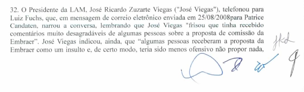 Entretanto o PCA da Linhas Aéreas de Moçambique, José Viegas, telefonou para o vice presidente da Embraer Europe e afirmou que “algumas pessoas receberam a proposta(de suborno) da Embraer como um insulto e, de certo modo, teria sido menos ofensivo não propor nada, mesmo que isso não fosse uma solução aceitável”.