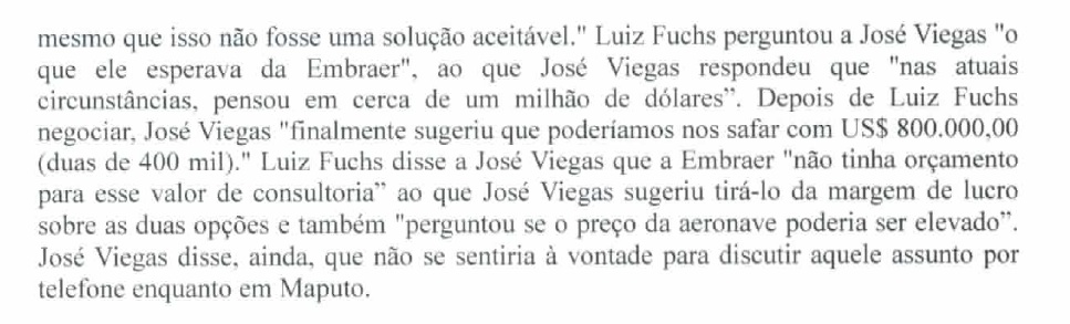 Os dois executivos negociaram e o PCA das LAM “finalmente sugeriu que poderíamos nos safar com 800 mil dólares”, reportou Luiz Fuchs que disse ter referido a Viegas que a Embraer não tinha orçamento para pagar esse montante de suborno ao que o gestor da transportadora moçambicana sugeriu tira-lo da margem de lucro e ainda “perguntou se o preço da aeronave poderia ser elevado”.