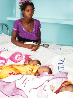 Cristina João, de 20 anos de idade, é mãe de três meninas recém-nascidas de um só parto, com 2.100, 2.400 e 2.500 quilogramas, no Hospital Central de Nampula (HNC), a 12 de Maio em curso. As trigémeas gozam de boa saúde, segundo os médicos, pese embora a parturiente padeça de dores intensas.