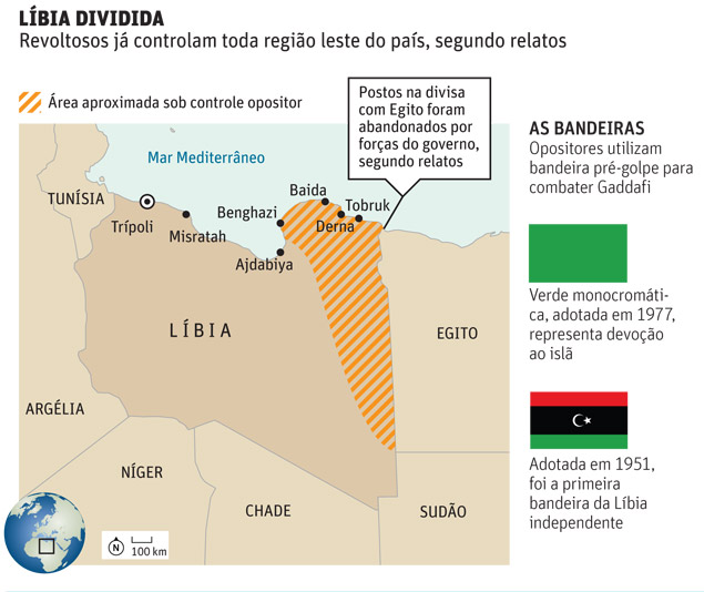 O líder líbio Muammar Khadafi perdeu já o Leste do país, que se encontra hoje nas mãos do movimento de revolta ao seu regime autoritário de mais de quatro décadas. As forças que permanecem leais ao regime de Trípoli concentram agora os combates no lado ocidental e todo o país parece mergulhado num caos sem lei nem ordem, a desmando de multidões armadas.