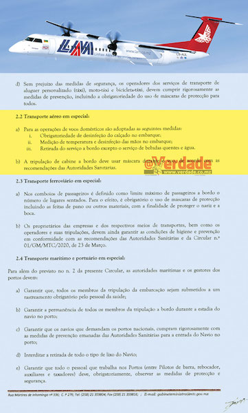O documento em alusão, elaborado pelo Ministério dos Transportes e Comunicações, preconiza no seu número 2.2, relativo ao Transporte aéreo, que “Para as operações de voos domésticos são adoptadas as seguintes medidas: obrigatoriedade de desinfeção do calçado no embarque; medição de temperatura e desinfeção das mãos no embarque; retirada do serviço a bordo excepto o serviço de bebidas quente e água. A tripulação de cabine a bordo deve usar máscara durante o voo, de acordo com as recomendações das Autoridades Sanitárias”.