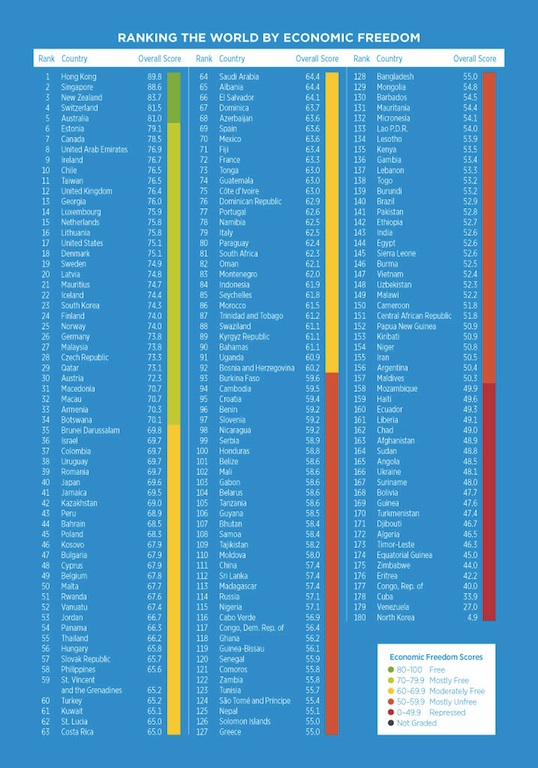A Liberdade Económica regrediu durante ano findo no nosso país, segundo a 23ª edição do índice promovido pela Heritage Foundation, em que foram analisados 180 países, Moçambique surge na 158ª posição, com 49,9 pontos em 100 possíveis. Contribuíram para esta classificação a má saúde fiscal, a cada vez pior integridade do Governo, a falta de efectividade Judicial e a fraca protecção dos direitos de propriedade.