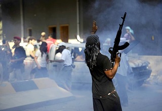 Fontes rebeldes citadas pela emissora Al Jazeera informaram que blindados foram vistos a deixar o complexo e efetuando disparos. Não há informações precisas se Khaddafi está em Bab al-Aziziyah, ou sobre qual seria seu paradeiro.