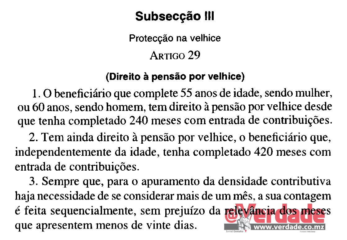 Também mais difícil ficou ter direito à pensão por velhice em Moçambique, o Regulamento que vigorou até a semana passada definia em 120 meses(10 anos) o tempo de contribuições ao INSS. Agora, “O beneficiário que complete 55 anos d idade, sendo mulher, ou 60 anos, sendo homem, tem direito à pensão por velhice desde que tenha completado 240 meses(Nota do Editor: 20 anos) com entrada de contribuições”, preconiza o número 1 do Artigo 29.