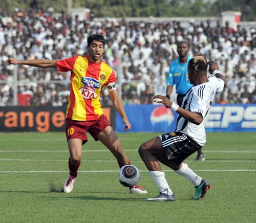 Aos 24, o lateral-esquerdo Mohamed Ben Mansour fez falta sem bola em Alain Kaluyituka e recebeu cartão vermelho. Infelizmente para o Espérance, o técnico Faouzi Benzarti teve que recompor a defesa tirando de campo o médio-atacante Oussama Darragi, um dos artilheiros da equipe. Para piorar a situação dos tunisinos, o jogador que entrou no lugar de Darragi, Zied Derbali, cometeu pênalti em Kabangu pouco antes do intervalo. Kaluyituka marcou com tranquilidade e chegou a sete golos no torneio.