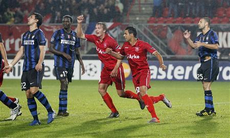 A Inter de Milão iniciou a defesa de seu título na Liga dos Campeões com um empate em 2 x 2 com o Twente Enschede, esta terça-feira, num jogo sob chuva pelo Grupo A. Wesley Sneijder, vaiado por alguns adeptos na sua volta à Holanda, colocou os visitantes na frente aos 13 minutos, após ressalto de um chute de Diego Milito.
