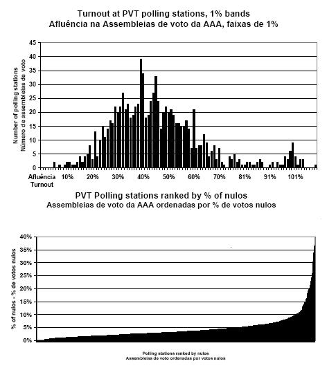 Haverá algumas poucas assembleias de voto que realmente tenham registado uma taxa de afluência elevada, por exemplo, dos jovens que se registaram para votar pela primeira vez este ano. Da mesma forma, também vimos muitas centenas de boletins de voto que estavam genuinamente inválidados, onde a mesma mão que tinha marcado caixas múltiplas. Mas podemos ter certeza de que um número incrívelmente elevado de postos de votação teve uma afluência de 100%, e que não é crível que em tão elevado número de assembleias de voto, tenha havido tanta gente marcando os seus boletins de voto com simultâneamente uma cruz para um candidato e uma impressão digital para outro.