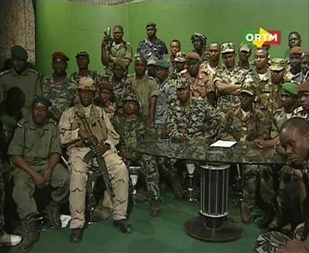 Membros do CNRDR leram um comunicado após disparos de armas pesadas durante a noite em torno do palácio presidencial na capital Bamako. “O CNRDR … decidiu assumir as suas responsabilidades pondo fim ao regime incompetente de Amadou Toumani Toure,” disse o tenente Amadou Konare, porta-voz do CNRDR.