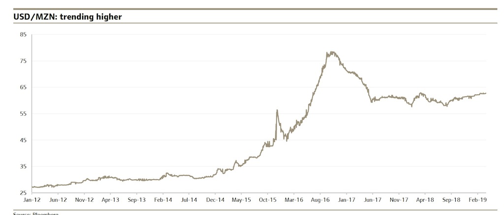 A moeda moçambicana continua a enfraquecer em relação as principais divisas, nesta quarta-feira (03) o Dólar norte-americano foi cotado a 64,67 Meticais. Esta depreciação iniciada em 2018 só deverá ser invertida na segunda metade de 2019, em função do inicio dos fluxos de entrada dos investimentos na Anadarko e ExxonMobil, da ajuda do FMI e de outros parceiros estrangeiros que prometeram ajuda às vítimas do Cilone IDAI.