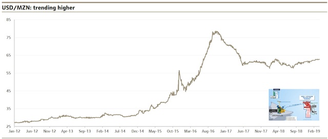 A moeda moçambicana continua a enfraquecer em relação as principais divisas, nesta quarta-feira (03) o Dólar norte-americano foi cotado a 64,67 Meticais. Esta depreciação iniciada em 2018 só deverá ser invertida na segunda metade de 2019, em função do inicio dos fluxos de entrada dos investimentos na Anadarko e ExxonMobil, da ajuda do FMI e de outros parceiros estrangeiros que prometeram ajuda às vítimas do Cilone IDAI.