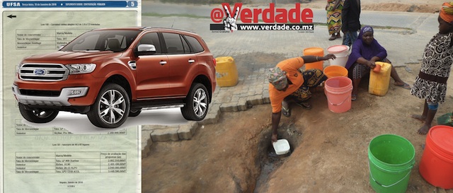 Em Dezembro de 2015, dois furos de água e a reabilitação de um pequeno sistema de abastecimento do precioso líquido foram adjudicados para serem construídos em Massangena, um dos seis distritos de Gaza mais atingidos pela seca, ao custo de 3.975.657,10 meticais. Apenas uma das “viaturas protocolares de campo” que Maleiane está a adquirir é um Ford Everest e custa 4.495.000 meticais.