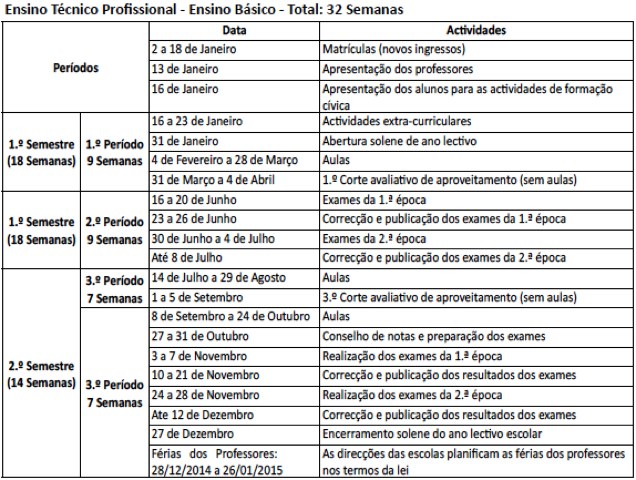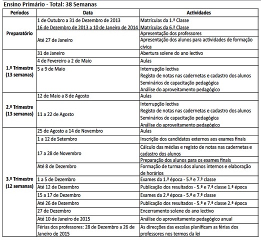 Na verdade, antes de se alterar o calendário escolar para Janeiro os estabelecimentos de ensino iniciavam o ano lectivo na primeira semana de Fevereiro. No ensino primário, de 01 de Outubro a 31 de Dezembro deste ano vão decorrer as matrículas da 1ª classe e as da 6ª classe terão lugar de 16 de Dezembro de 2013 a 10 de Janeiro de 2014, devendo os pedagogos apresentar-se nos seus postos de trabalho a 27 de Janeiro próximo.