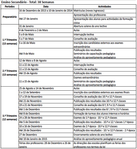 Assim, quer no ensino primário, quer no secundário, o primeiro trimestre escolar decorrerá de 04 de Fevereiro a 02 de Maio, o segundo trimestre entre 12 de Maio e 08 de Agosto e o último entre 25 de Agosto a 14 de Novembro, nas classes sem exame. O encerramento do ano lectivo só terá lugar a 27 de Dezembro.