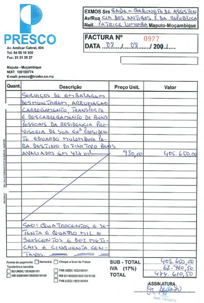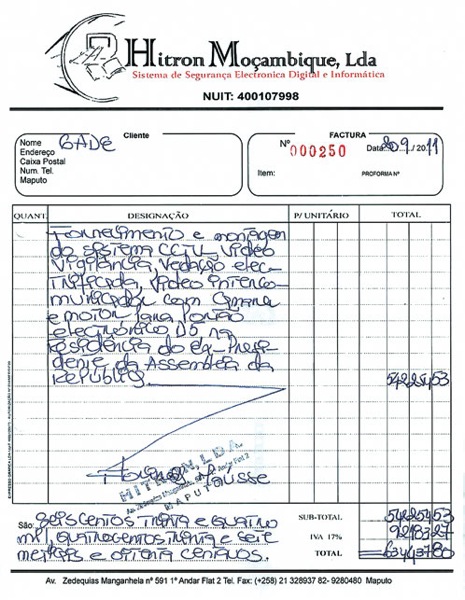 Na cotação encontram-se oito câmaras bullet Samsung exteriores com 30 metros de capacidade de visualização. Cada artigo, dos oito citados, custa 13.746 meticais. Também descortina-se um DVR Digital Record Samsung de 16 canais SRD fixado em 188.580 meticais. Há, refira-se, um painel energiser orçado em 35.992.10 meticais. Na factura no 70 referente à montagem do sistema de vedação eléctrica constam alguns dos itens acima referidos. No documento posterior, com o no 71/11, de 01/08/2011, o custo a ser pago pelo Estado é de 54.682.06 meticais para a montagem do vídeo intercomunicador.