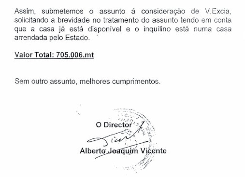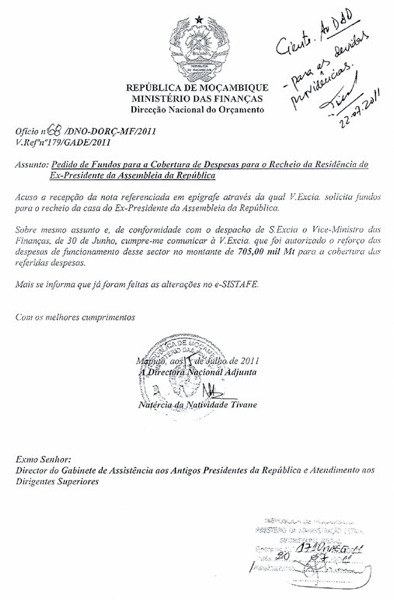 Para o recheio da casa arrendada pelo Estado em benefício do antigo presidente do Parlamento moçambicano, o GADE solicitou à Direcção Nacional de Contabilidade Pública (DNCP) o montante de um milhão, duzentos e vinte um mil, cento e noventa e cinco meticais e sessenta e nove centavos (1.221.195,69MT) para a compra do mobiliário e cortinados. A DNCP submeteu à “consideração superior para a melhor decisão, propondo a autorização do pagamento do valor” na CED 143402, não obstante a rubrica não estar dotada na tabela do Orçamento.