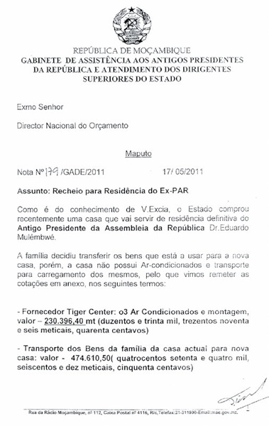 Em nota datada de 17 de Maio de 2011, no qual o GADE, além de sublinhar a aquisição de uma casa pelo Estado que serviria de residência definitiva do antigo presidente da AR, enviou à DNCP uma requisição de fundos no valor de 705.006,90MT. O montante destinava-se ao pagamento do fornecimento e montagem de oito aparelhos de ar condicionado e o transporte dos bens da família Mulémbwè da casa provisória para a nova.