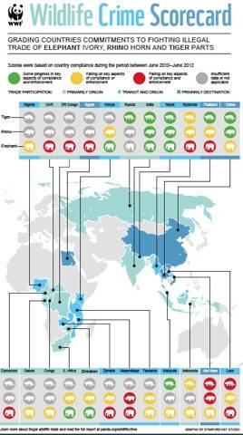 A China, tradicionalmente um mercado importante para partes de animais, foi premiada com notas verdes por seus esforços para diminuir o comércio ilegal de rinocerontes e tigres, mas recebeu uma nota amarela para o seu trabalho no comércio de marfim de elefante.