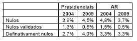 A tabela compara os nulos presidenciais e parlamentares e a sua validação em 2004 e 2009. A baixa taxa de validação sugere que muitos mais dos votos considerados inválidos na mesa de voto, eram realmente nulos. Mas não há razão nenhuma para pensar que os eleitores estão menos treinados e mais provávelmente sujem boletins de voto. O que sugere é que o problema de membros da mesa que ilicitamente invalidam votos, em geral com uma marca de tinta, se tornou muito grave de facto.