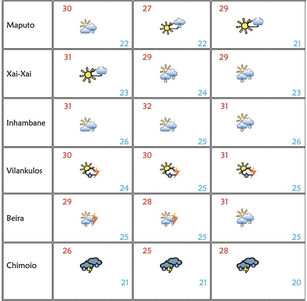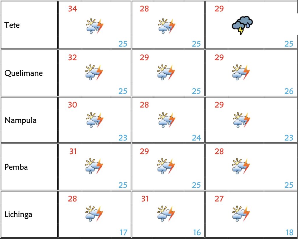 Eis as temperaturas previstas para quarta-feira(24), quinta-feira(25) sexta-feira(26) em Moçambique: