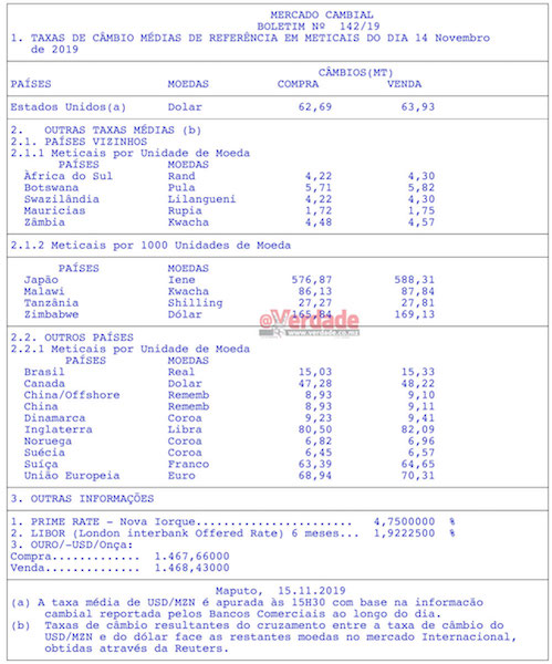 Depois de no mês de Junho ter-se apreciado até 61,75 m relação ao dólar norte-americano o metical reagiu negativamente ao período eleitoral, quando a campanha iniciou a cotação do dólar era de 61,92, na véspera da votação foi transaccionado a 62,82, continuou a enfraquecer e na sexta-feira (15) foi vendido nos bancos comerciais acima dos 64.