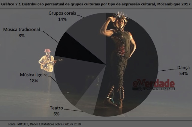 Grafismo de Nuno TeixeiraMoçambique tem mais de 7 mil grupos grupos culturais dos quais 54 por cento dedicam-se à dança, 18 por cento à música ligeira, 14 por cento são grupos corais, 8 por cento praticam a música tradicional e apenas 6 por cento fazem teatro. A maioria dos dançarinos encontram-se na Região Norte, particularmente na província do Niassa.