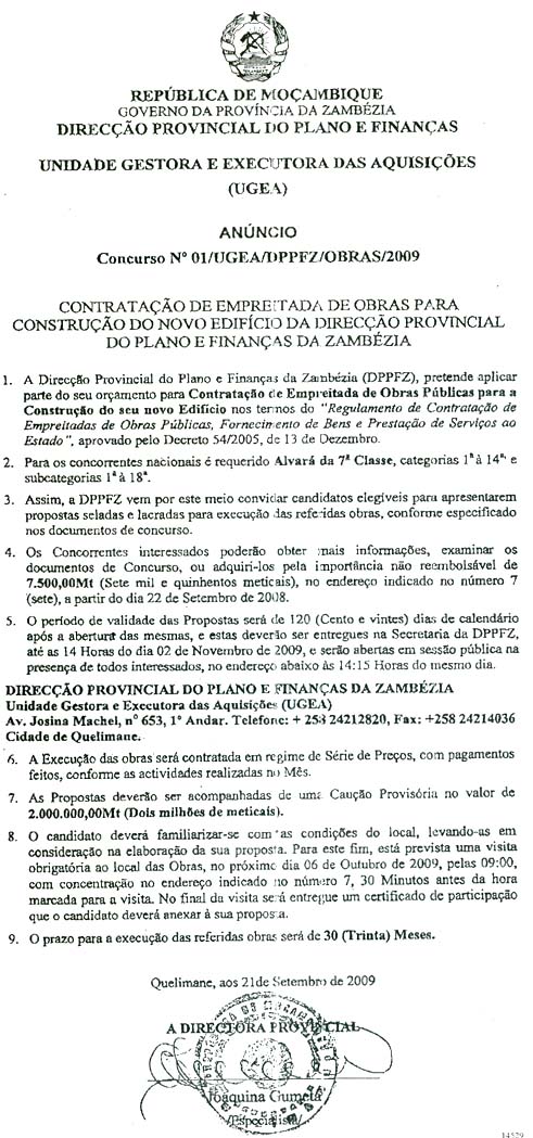Nº01/UGEA/DPPEZ/OBRAS/2009