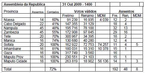 Usando a contagem provisória de 72% das assembleias de voto, estima-se que a Frelimo terá 192 assentos, a Renamo 48, e o MDM 8. O MDM terá 5 em Sofala e 3 na cidade de Maputo, e aqui é definitivo porque 100% dos votos já foram contados. Não é provável que ganhe assentos em Inhambane ou Niassa, as outras duas províncias em que concorreu.