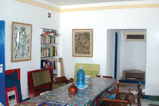Duas estantes – uma com louça e outra com livros –, uma mesa de jantar, cadeiras em volta, uma geleira e uma arca congeladora completam o rol de objectos. O quarto, à esquerda de quem entra, era o do mestre. Uma cama alta de madeira ocupa a parte de leão, onde ainda se vêem duas mesinhas com tampo de mármore e, no chão, a parafernália que existe sempre em casa de um pintor: tintas e pincéis.