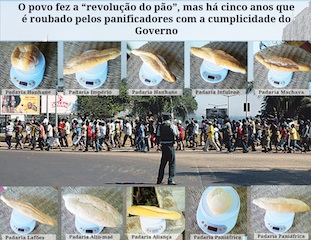 É certo que o Governo não aumentou o preço do pão, nem da energia eléctrica e da água potável, como pretendia a 1 de Setembro de 2010 vergando-se à revolta popular na capital moçambicana. Mas a verdade é que nos últimos cinco anos, apesar de o Executivo subsidiar a farinha de trigo para os panificadores, temos sido enganados no peso do pão que compramos todos os dias. Em vez dos pesos que as padarias praticam deveriam vender-nos pão com um destes pesos: 45 gramas, ou 68 gramas, ou 100 gramas, ou 130 gramas, ou 210 gramas, ou 240 gramas, ou 450 gramas, ou 500 gramas ou ainda 1000 gramas.