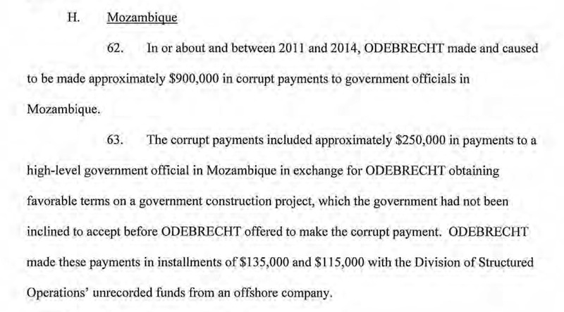 “Os subornos incluíram aproximadamente 250 mil dólares norte-americanos em pagamentos para quadros do alto escalão do Governo de Moçambique para que a Odebrecht conseguisse termos favoráveis no projeto de construção governamental, que o Governo não estava inclinado a aceitar antes da Odebrecht oferecer o suborno. A Odebrecht efectuou os pagamentos em parcelas de 135 mil e 115 mil dólares através da sua divisão de Operações Estruturadas usando fundos de uma uma companhia sediada num paraíso fiscal”, refere ainda o acordo de leniência.
