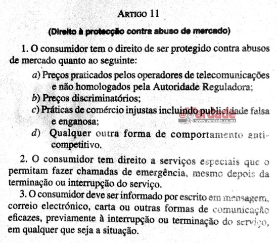 Os operadores de telefonia móvel celular e provedores de internet em Moçambique são agora obrigados a respeitar a privacidade dos seus clientes, submeter os preços dos seus serviços à homologação da Autoridade Reguladora das Comunicações, responder as reclamações dos clientes no máximo de 15 dias e, dentre outras regras, só podem enviar mensagens publicitárias entre as 6 e 21 horas.