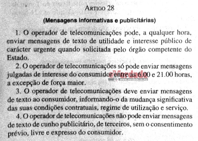 Relativamente ao marketing e publicidade a Autoridade Reguladora das Comunicações foi mais longe impondo, no número 2 do Artigo 28, que: “O operador de telecomunicações só pode enviar mensagens julgadas de interesse do consumidor entre as 6 e 21 horas, a excepção de força maior”, ademais, no número 4 do referido Artigo, determina: “O operador de telecomunicações não pode enviar mensagens de texto de cunho publicitário, de terceiros, sem o consentimento prévio, livre e expresso do consumidor.”