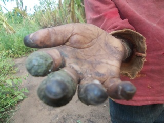 Os miúdos moram numa pequena palhota, rodeada por machambas. Quando chegámos, o mais velho encontrava- -se a trabalhar e o mais novo a brincar, pese embora os ferimentos ainda se encontrem numa situação delicada e a precisar de cuidados. Constantino tem o braço e os cinco dedos da mão direita inchados e cobertos por uma camada de medicamento tradicional.