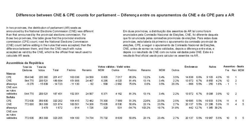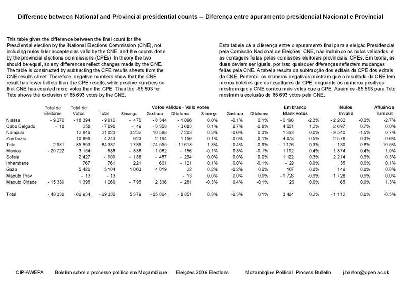 E isto é o que parece ter obrigado às grandes exclusões de Niassa e Tete – embora não seja claro porque razão outras afluências igualmente exageradas, em Gaza, não foram rejeitadas. Mas é conhecido que a CNE numa reunião concordou em rejeitar algumas afluências muito altas. Segundo, o STAE em Maputo parece ter conseguido usar alguns editais que foram enviados para Maputo quando as províncias não conseguiram introduzi-los na base de dados. Isto levou a aumentos de votos na maior parte das províncias, no total de 37,099 votos na corrida presidencial. Algumas variantes, por exemplo nos nulos, nos votos em branco e mesmo no número de eleitores registados, não são fácilmente explicáveis. E não foi dada nenhuma explicação.