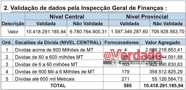 Contudo o @Verdade apurou que o que o Estado assume pagar é menos de metade da dívida global apurada em 26,7 biliões de meticais, pois que a Inspecção Geral das Finanças apenas validou 10.418.291.185,94 meticais desse montante.