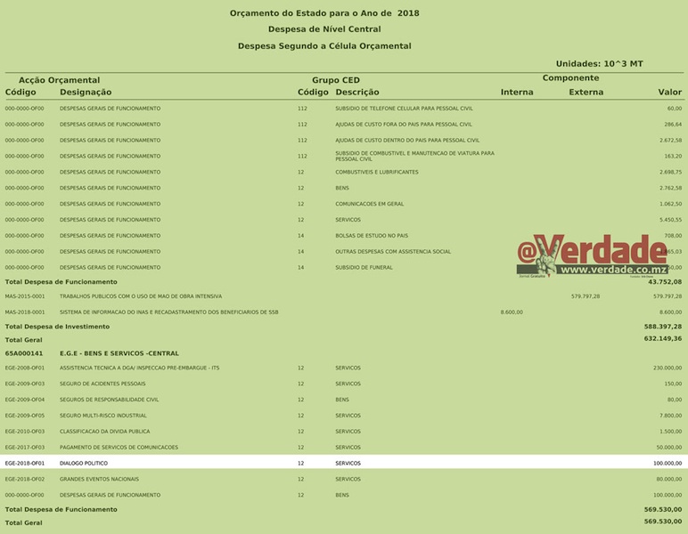 Nenhuma explicação nem detalhe é dado sobre os itens em que será gasto esse montante. Aliás as quatro acções previstas no Plano Económico e Social sobre a Paz nenhum deles está directamente relacionado com o diálogo entre o Presidente Nyusi e o líder do partido Renamo.
