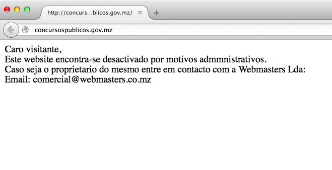 Outro sítio na internet que também não está disponível é o da Unidade Funcional de Supervisão de Aquisições (UFSA) onde deveriam ser disponibilizados todos os concursos públicos em cursos, assim como apresentar a listagem actualizada das empresas que fornecem bens e serviços ao Estado. Há mais de seis meses que o sítio http://concursospublicos.gov.mz/ está offline, apesar disso continua a ser publicitado pela Direcção Nacional do Património no suplemento que publica no diário estatal.