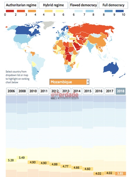 Confrontado com o índice de Democracia elaborado pela “The Economist”, que anualmente avalia 167 países, e que colocou em 2018 Moçambique na 115ª posição entre os “regimes autoritários”, depois de no início do seu mandato estar na posição 105 entre os “regimes híbridos”, devido as irregularidades registadas nas Eleições Autárquicas do ano passado o Presidente Nyusi disse à televisão e rádio públicas de Portugal que: “Os estudos são feitos em função da amostra que a pessoa colhe a informação, depende de que amostra foi. Ou então há algumas pessoas que consideram a Democracia quando ganha aqueles que eles gostariam, eu não sei qual era a preferência deles para que ganhasse para se considerar um país mais democrático”.