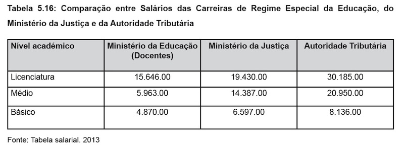 “47.4% afirmaram que o salário não tem sido pago no período previsto nos dispositivos normativos. Em relação a este último aspecto, note-se, contudo, que uma parte relevante dos inquiridos (40.8%) mostra que, ao contrário dos outros, o salário chega no tempo previsto. Os professores das carreiras de N4 e N5 auferem salários mais baixos, não usufruindo do regime especial de salários”.
