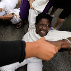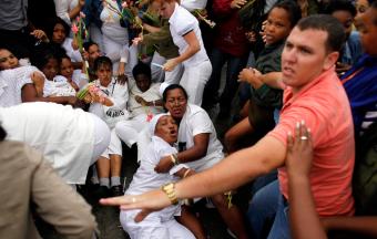 Os partidários do regime cubano repudiaram as mulheres, que iniciaram sua jornada de preces em um templo católico da região e, ao que parece, tentavam visitar o dissidente Orlando Fundora, um dos 75 presos de 2003, libertado por motivos de saúde. “Elas têm que entrar (no ônibus) à força, é o que merecem, isso é uma provocação”, disse Margarita Rodríguez, dona de casa que participou da manifestação pró-governo. “Nos trouxeram diretamente para a casa de Laura Pollán, arrastadas, mas estamos todas aqui e vamos continuar com os protestos, a não ser que sejamos presas”, declarou por telefone à AFP Bertha Soler, depois de afirmar que “o governo está encurralado e, por isso, faz essas coisas”.