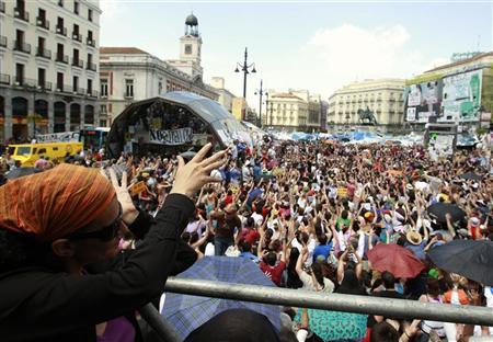 Centenas de pessoas jovens e velhas votaram na noite de domingo por manter um acampamento de protesto montado há duas semanas na praça central Puerta del Sol, em Madri, até quinta-feira pelo menos, iniciativa ecoada na segunda maior cidade da Espanha, Barcelona. Apelidados de “los indignados”, dezenas de milhares de manifestantes lotaram praças em todo o país em uma onda de ultraje diante do alto índice de desemprego e as medidas de austeridade adotadas pelo governo no período que antecedeu as eleições locais e regionais de 22 de maio.