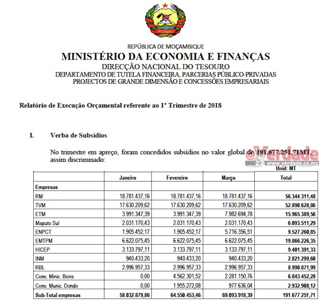 No global, durante o 1º trimestre, o Governo concedeu subsídios que ascendem aos 191 milhões de meticais a nove Empresas Públicas e dois Conselhos Municipais. As Empresas de Transporte Municipal de Maputo e da Matola são aquelas que receberam subsídios substâncias, 19,8 e 15,9 milhões de meticais respectivamente.