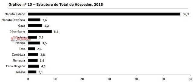 Entretanto os dados do INE indicam que a Cidade de Maputo é aquela que continua a receber maior número de hóspedes nacionais com 41 por cento, seguida por Gaza 8,7 por cento, os turistas estrangeiros também preferiram a capital do país para fazer turismo 69,1 por cento, apesar de não possuir as melhores praias e nem mesmo o melhor ecoturismo de Moçambique.