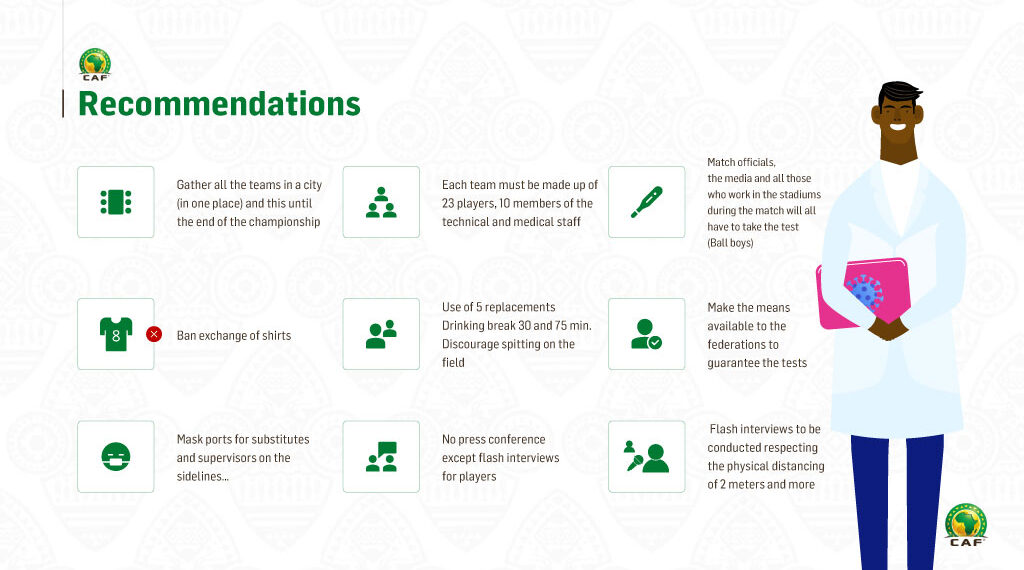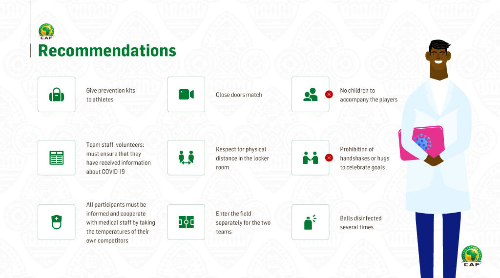 Antes da retoma dos jogos a Confederação Africana de Futebol recomenda a criação de acomodação e transporte organizado para os envolvidos nos jogos, a desinfecção de equipamentos e campos, jogar a portas fechadas com áreas de acesso limitado e com um plano de movimentação das pessoas envolvidas em cada jogo. Não podem haver conferencias de imprensa, apenas entrevistas flash respeitando o distanciamento social.
